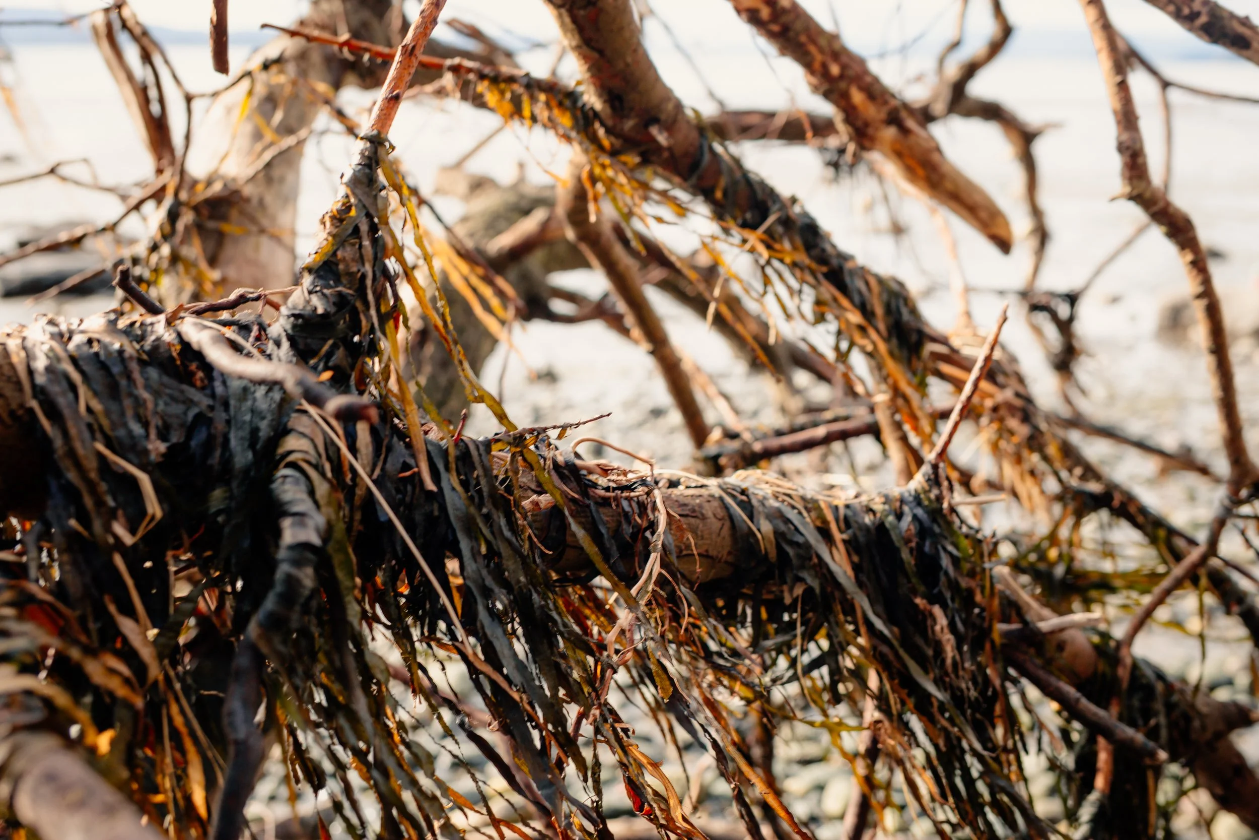 Eelgrass on a tree at Padilla Bay beach, Feb. 16, 2026. These blades must’ve gotten onto the tree at high tide. // Photo by Harley Brown