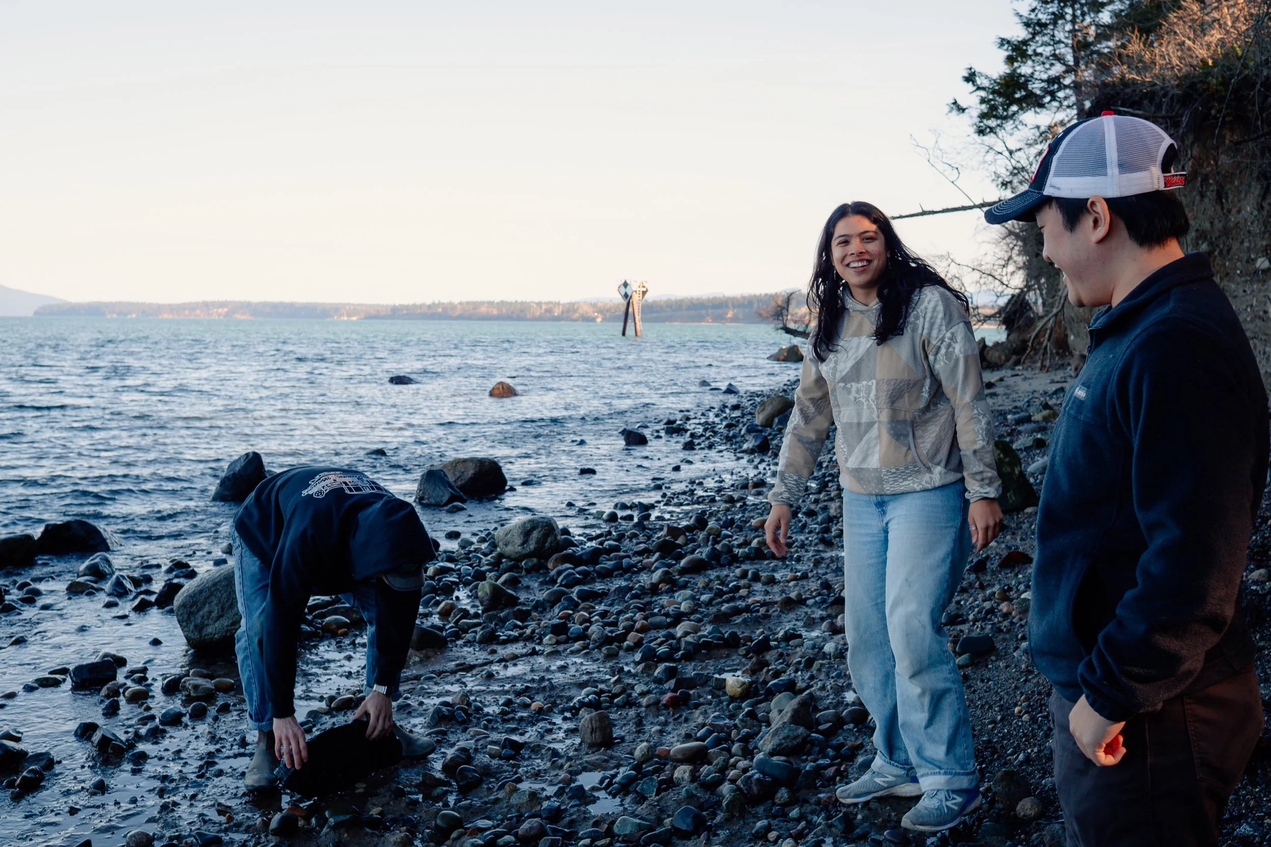 Ian McBride (left), Rachel Corichi (middle) and John Vu (right) on the Shannon Point Research Center beach. From this point, you can easily see across the waters between Padilla Bay and the Rosario Straight to the Cypress and Guemes Islands. // Photo by Harley Brown