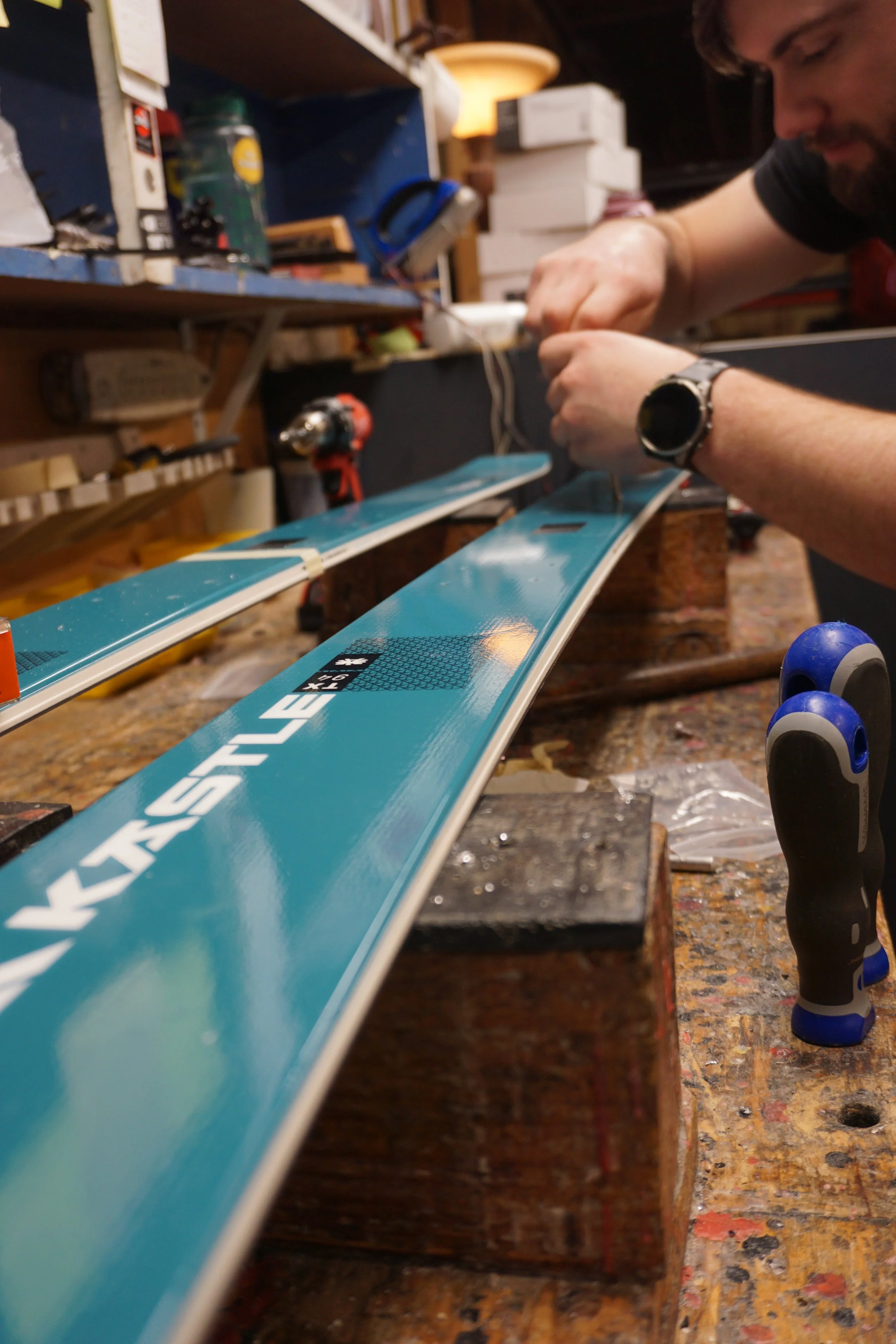 A worker tunes up a pair of skis at the Backcountry Essentials Ski Shop in Bellingham, Wash., on Feb. 18, 2026. On the bottom floor of the shop, Backcountry Essentials offers full-service in ski and snowboard tune-ups, mounting bindings, skin trim, binding adjustments, calibrations, and more. // Photo by Jordan Brotamonte