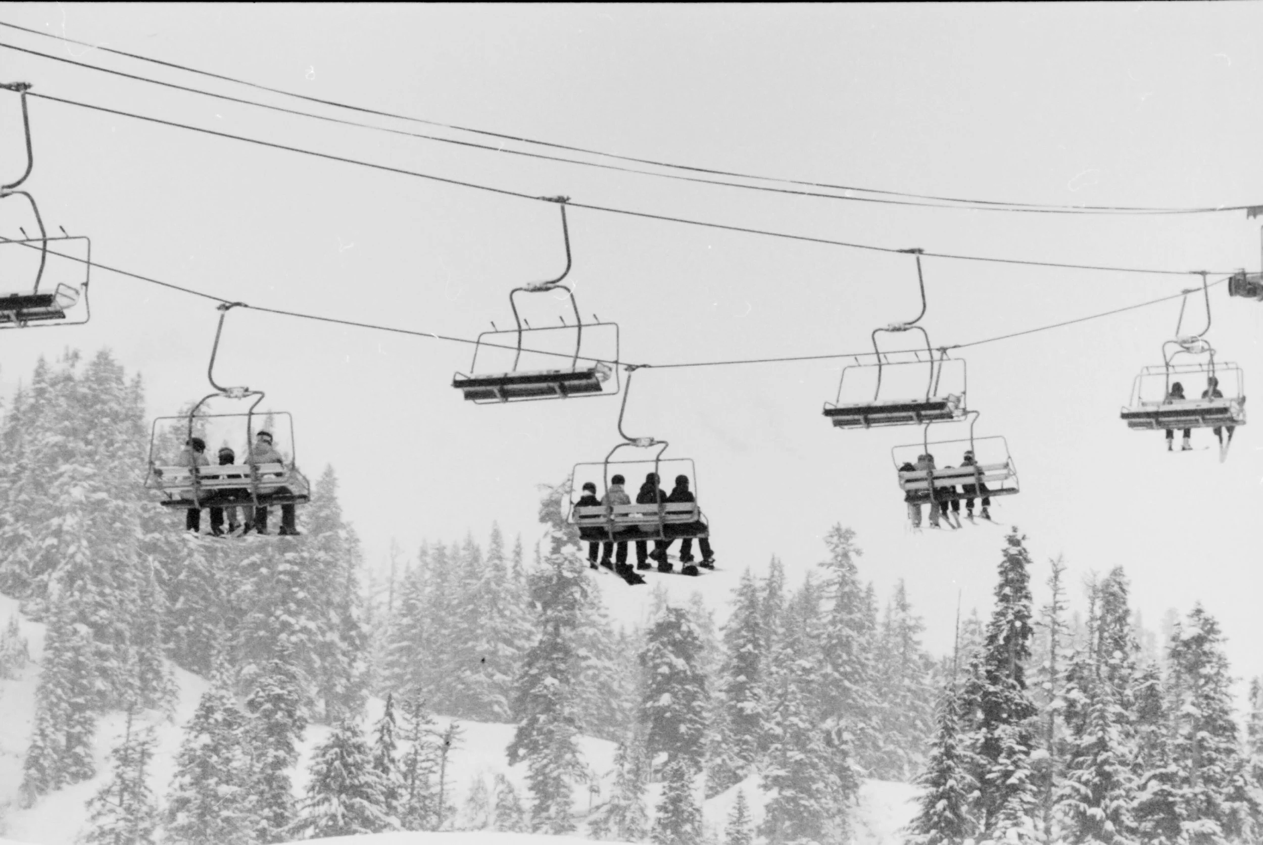Skiers and snowboarders ride a chair lift at the Mount Baker Ski Area in Deming, Wash., on Feb. 22, 2026. The resort is in the process of installing a new electric motor at the White Salmon base area, which will reduce carbon emissions by 80%. // Photo by Avery Robertson