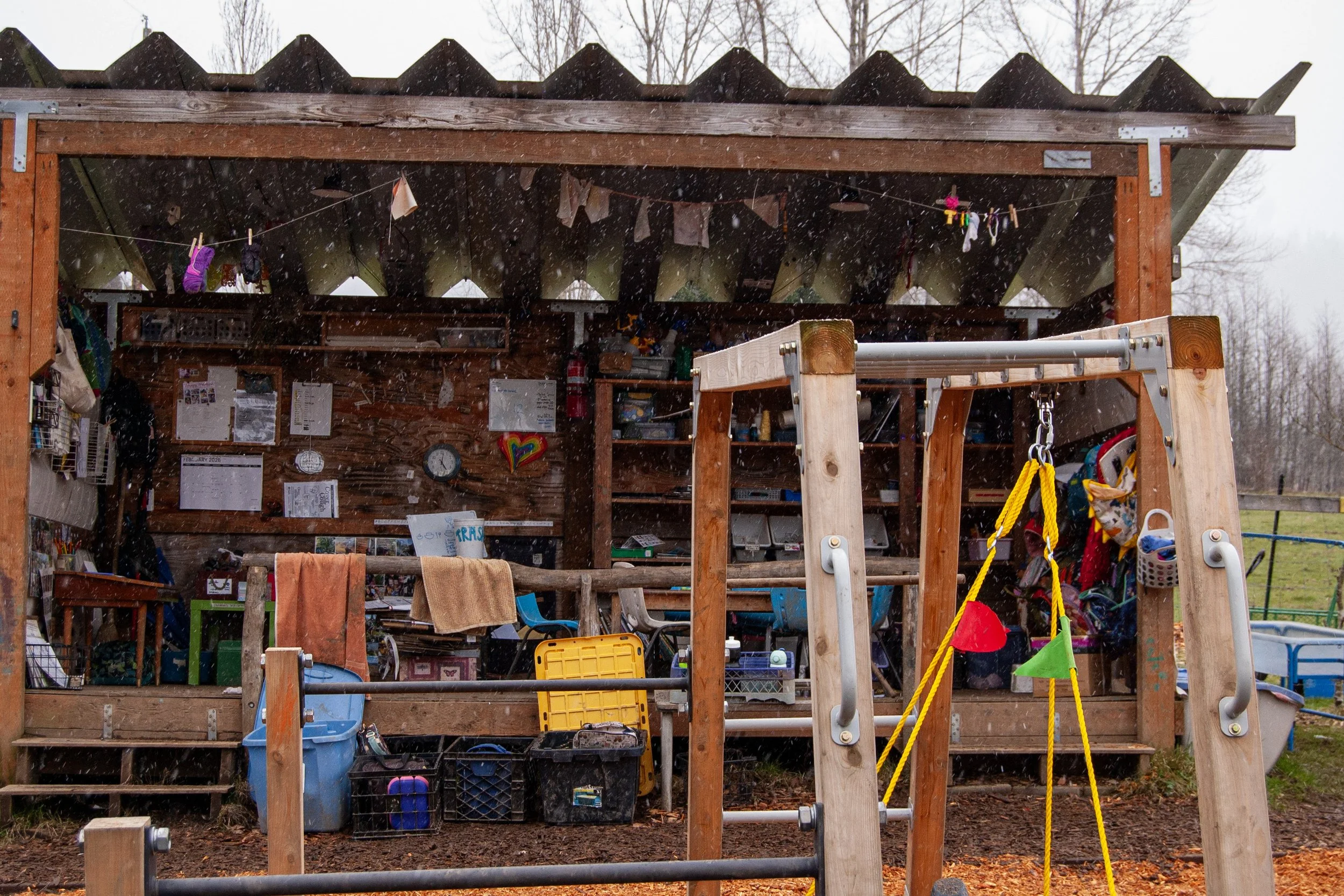 Snow falls outside of a classroom at Barefeet Farm School in Whatcom County, Wash., on Feb. 18, 2026. // Photo by Liam Britt