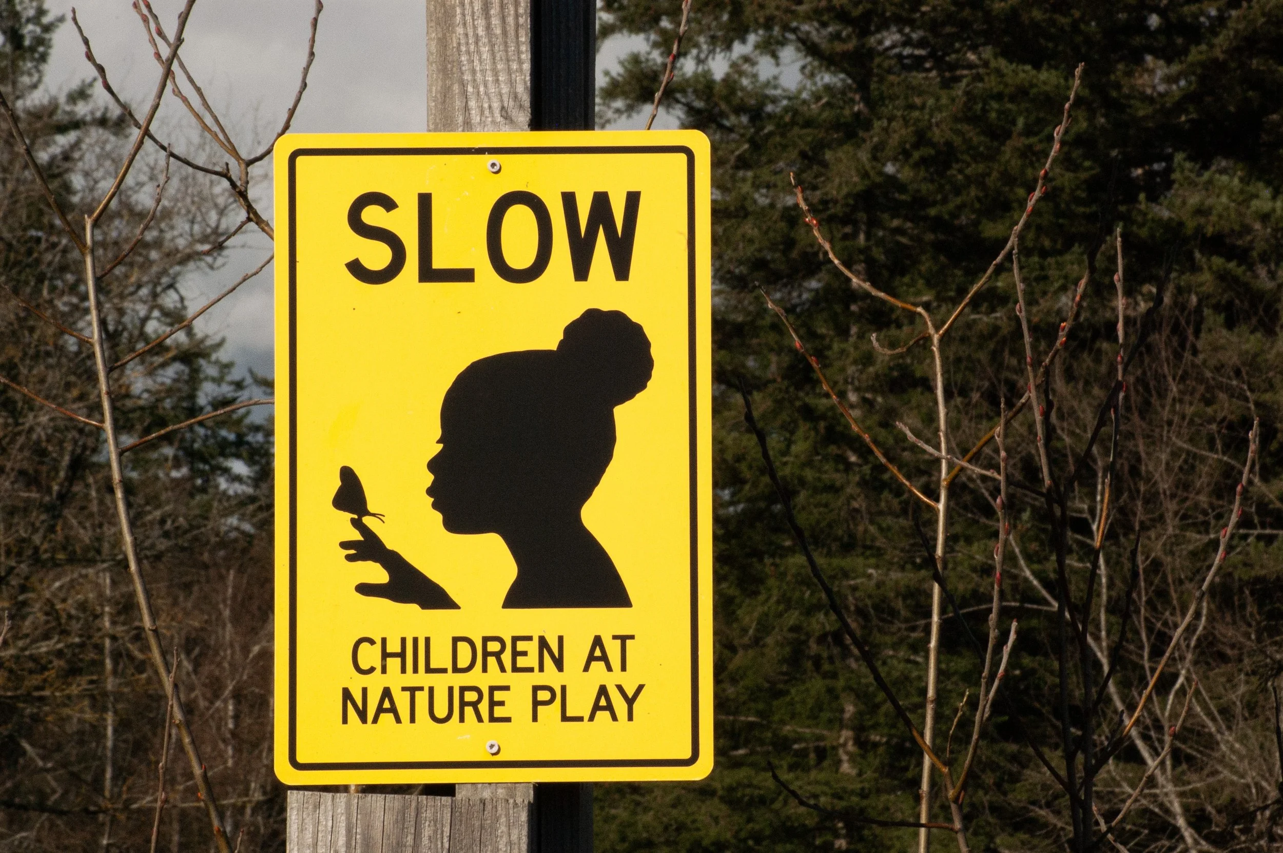 A caution sign warning of ‘children at nature play’ sits in front of East of Eden Nature Preschool in Whatcom County, Wash., on March 5, 2026. // Photo by Liam Britt