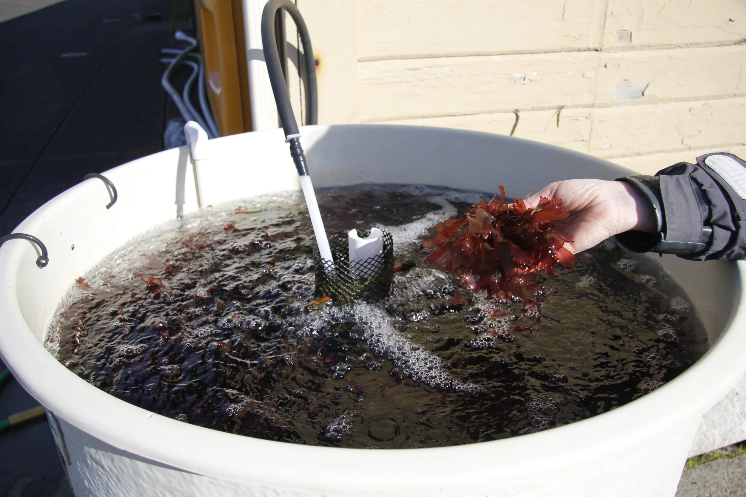 Dulse seaweed, another favorite food of abalone, being grown in a water tumbler at the Port Townsend Marine Science Center. // Photo by Brooklyn “Bug” Santee
