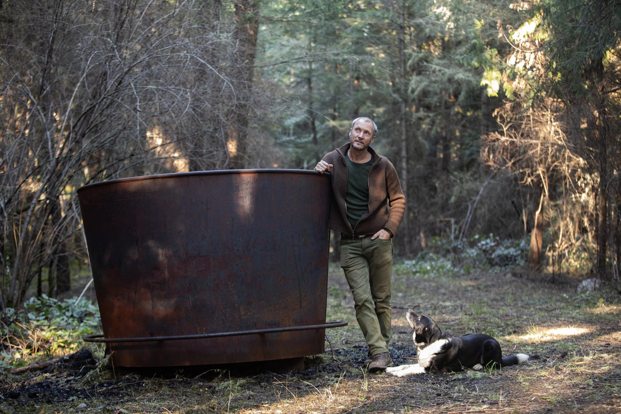 Jelte Wilde leans against the largest of his three flame-cap biochar kilns, posing with his dog, Tesla, at a job site on Lopez Island on Feb., 10, 2026. He's designed his kilns to be portable, though many kilns require machinery to move from site to site. // Photo by Liam Britt