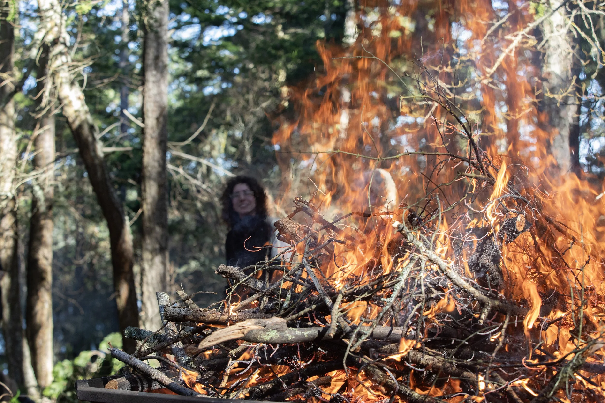 Max O’Conner smiles at the camera while a flame-top biochar kiln burns on Lopez Island, on Feb. 10, 2026. These burns last anywhere from 4-8 hours, requiring care to efficiently produce biochar. // Photo by Liam Britt