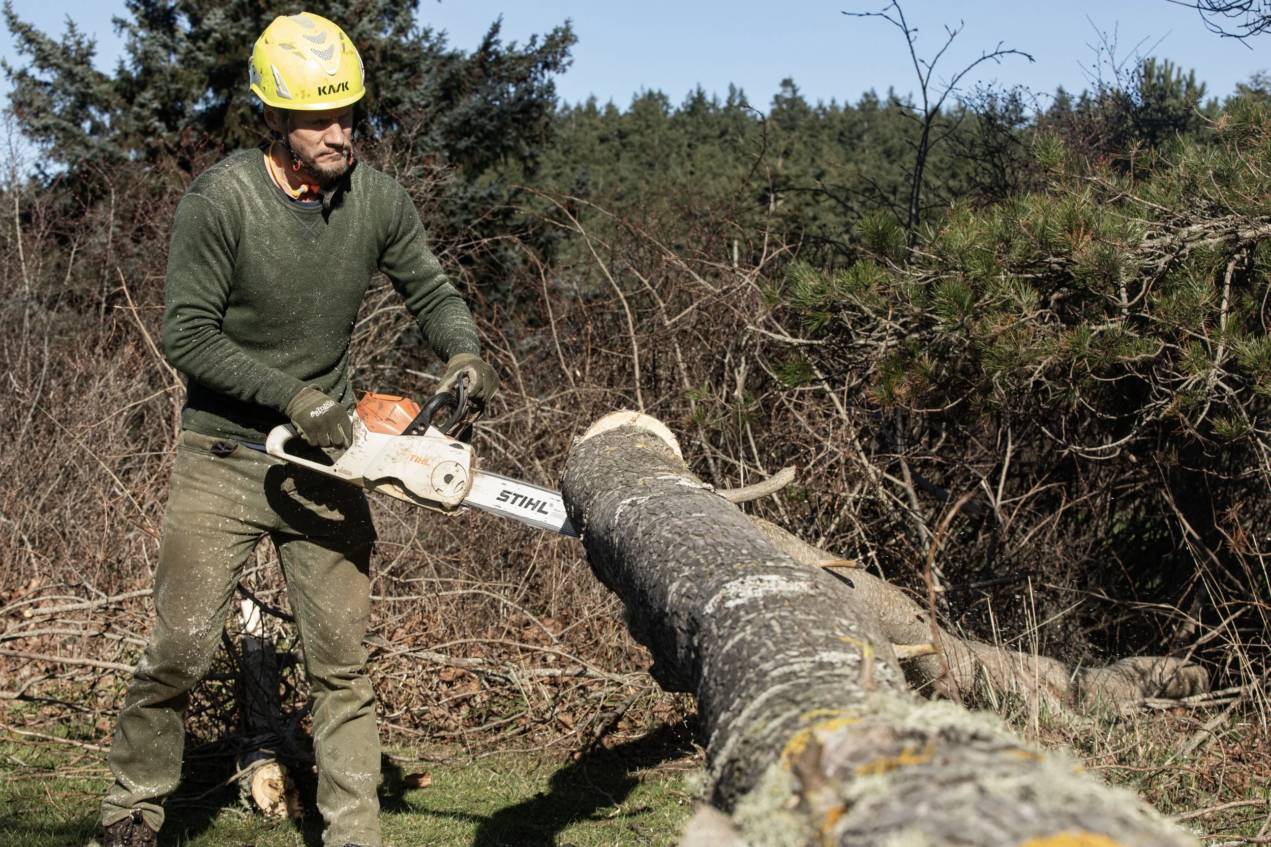 Jelte Wilde cuts a large branch into pieces on Lopez Island, Wash., on Feb. 10, 2026. Often, he'll be working on multiple job sites across Lopez Island at a time. // Photo by Liam Britt