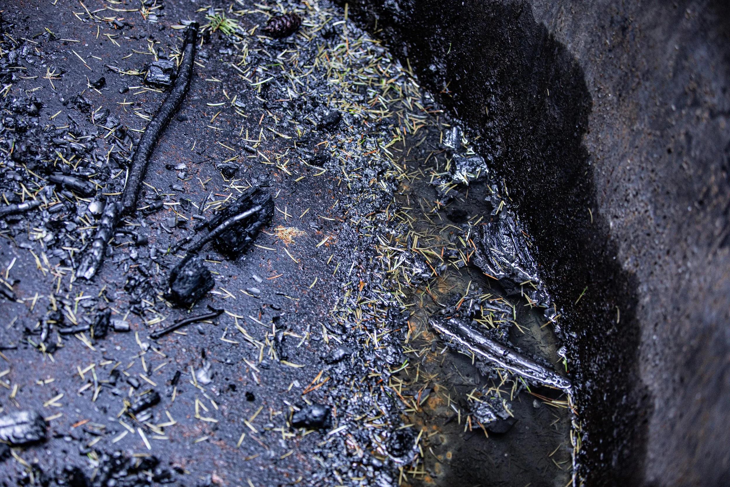 Leftover biochar sits at the bottom of a kiln after being spread throughout a forest on Lopez Island, Wash., on Feb. 10, 2026. A cubic yard of biochar can cost upwards of $100 if you're buying it from a distributor, leading many to make their own. // Photo by Liam Britt