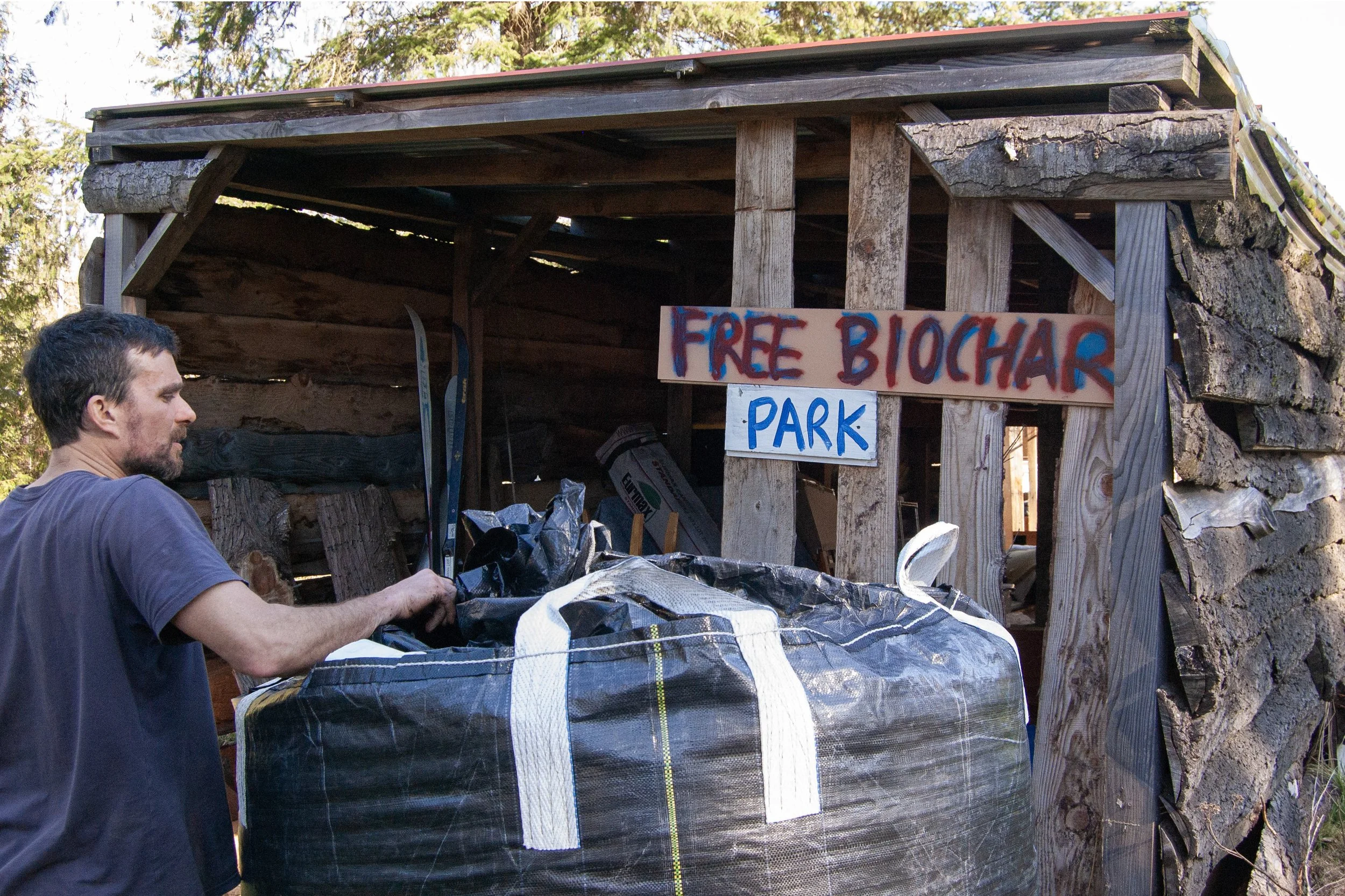Jelte Wilde, an arborist and forester, works with biochar through his business, Wilde Steading. With his small crew, he trims and maintains forests throughout the San Juan Islands. They turn the piles of organic debris into biochar, scattering it on the forest floor.