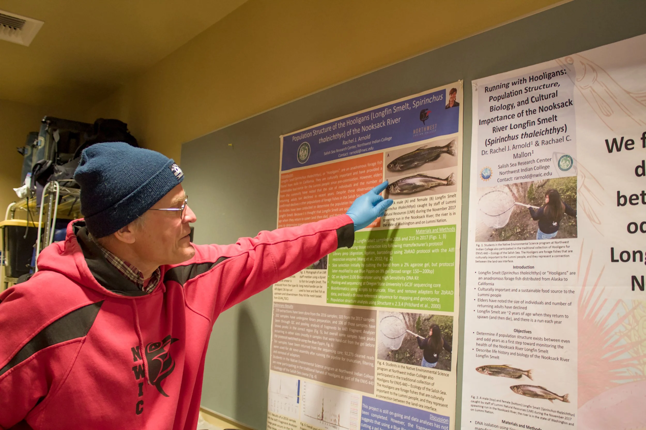 John Rombold, associate director of the Salish Sea Research Center at the Northwest Indian College, pointing at a diagram on hooligans. Jan. 30, 2026. // Photo by Elena Delgado