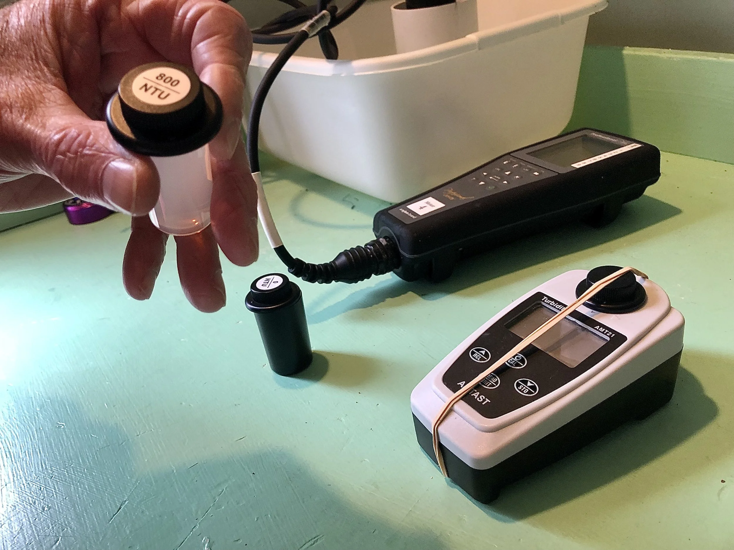 Tim Gohrke holds a sample from a stormwater outfall above some water quality testing equipment at his home in Anacortes, Wash. Although he doesn’t have a scientific background, now that he’s retired, he spends time learning how to use this equipment while managing Friends of Skagit Beaches.