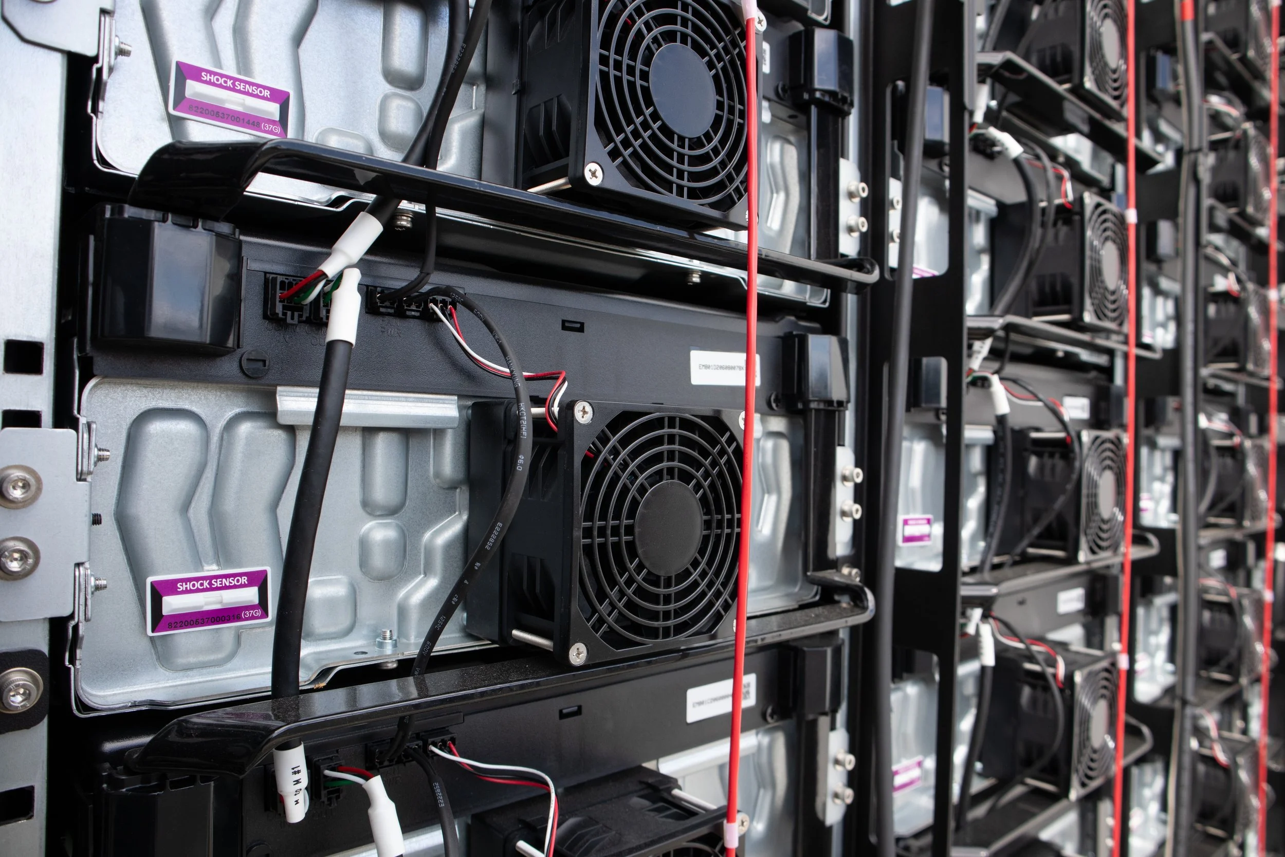 May 1, 2024 – Snohomish, WA- Battery cells are aligned in several stacks in a 1,400 kWh lithium-ion battery storage system at the Arlington Microgrid project. // Photo by Nick Whitehead
